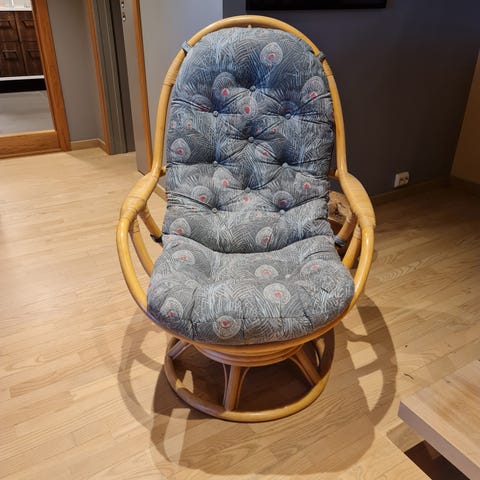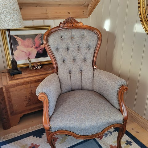 Veldig dekorativ stol i fletting. Pent håndverk med treskruer. Liten defekt i flettingen, men har ingenting å si for sittekomforten. Av den grunn selges stolen rimelig.
