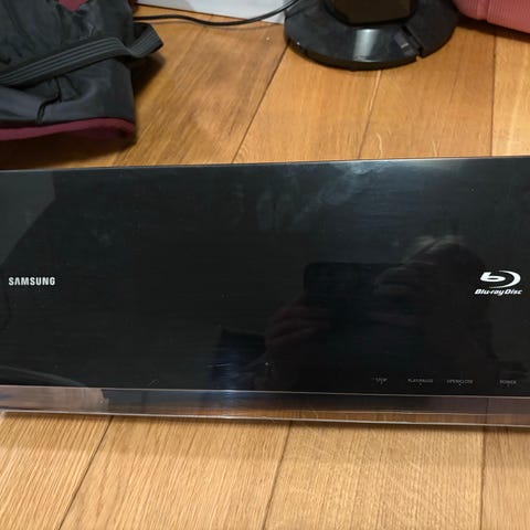 Samsung Blu-ray-spiller med fjernkontroll. Enheten har standard tilkoblinger for avspilling av Blu-ray-plater og andre kompatible medier. Fjernkontrollen har tydelige knapper for enkel navigasjon. Hentes i Larvik.