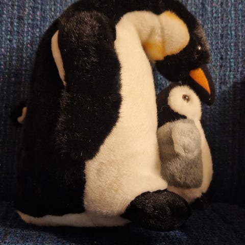 Datteren min selger IKEA bamse bestående av en myk pingvin og en strikket ku. Pingvinen er laget i mykt materiale med grå og svart farge. Den strikkede kua har rosa og hvit farge med detaljer i garn.
