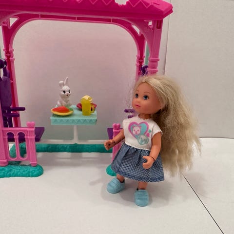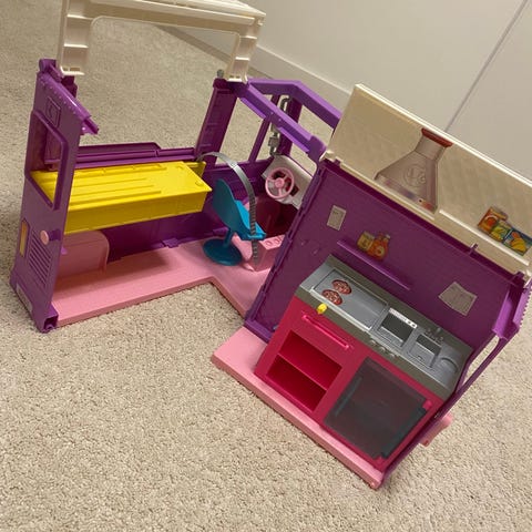 Frost slott med møbler. Passer til Barbie. Slottet er pent brukt, men noen klistremerker er litt avrevet. Lys i heis fungerer. Har de fleste møblene som hører til, men mangler en stol og noen tepper til sengene, samt vasken som skulle stått oppå kjøkkendeleb. Det er ca 150 cm høyt og 100 cm langt. Det kan ikke demonteres og må hentes.