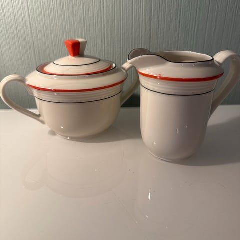 Den har en art deco-stil med en rød kant og en tynn svart linje på kremfarget porselen.