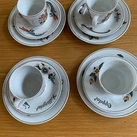 Porsgrunn Porselen Astra, sukkerskål og 3 tallerkener / asjetter. Asjettene som vi har to av er 16,5 cm i diameter, og frokosttallerken er 21 cm i diameter. .