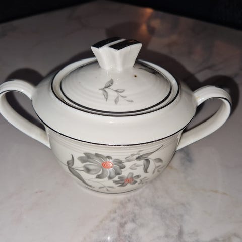 Sukkerskålen har to håndtak og et lokk med et rødt håndtak.