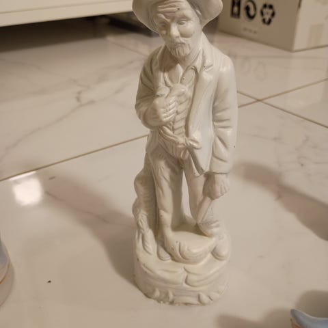 To hundeskulpturer laget i keramikk. Den ene er hvit og den andre er svart med brune detaljer. Begge er utformet som sittende hunder med realistiske detaljer.