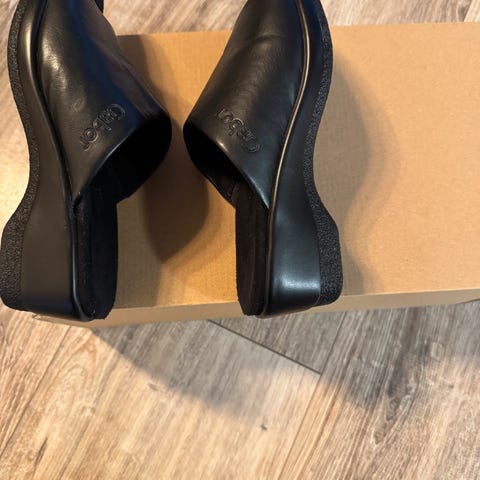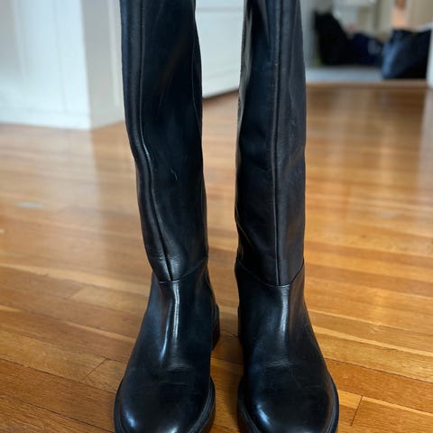 Klassiske sorte kne-høye støvler i glatt skinn/kunstskinn. Lav hæl og behagelig passform. Pent brukt og i god stand. Passer til både hverdag og penere antrekk.