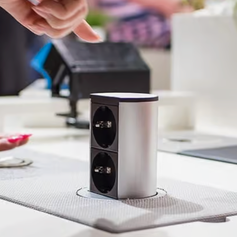 Bachmann Twist 2S strømuttak med to stikkontakter. Produktet har en fleksibel kabel og er designet for innfelling i bord eller arbeidsflater. Farge: sølv
