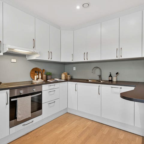 Moderne hvit kjøkken med integrerte hvitevarer og kjøkkenøy