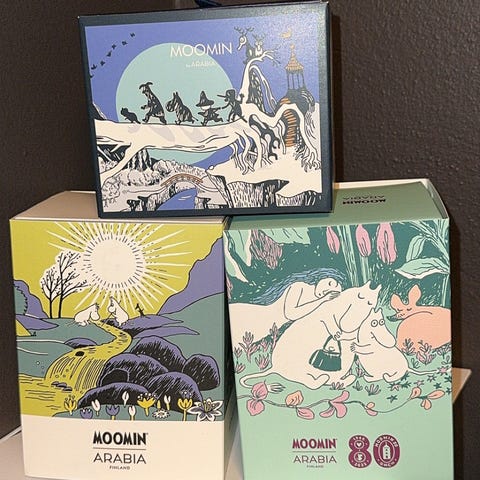 Selger en samling på seks Mummidagkopper Vår 2024. Et Mummi kjøkkenhåndkle følger med.