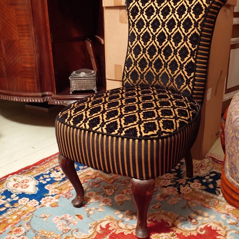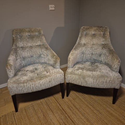 2 pene og gode lenestoler i Kolonistil / Empirestil. Trukket med alcantara stoff.
