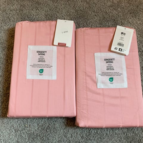 Det kan følge med to sengesett. Ett med små stjerner i hvitt og beige, ett annet hvor det står «sov søtt lille venn» ,det er hvitt og grått. Dette har vært hos besteforeldrene, så ingen daglig bruk.