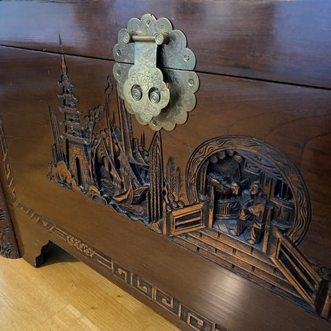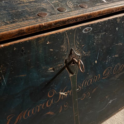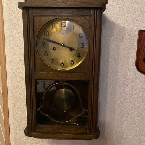 Antikk gulvur laget i tre med pendelmekanisme. Uret har en dekorativ front med utskjæringer og en glassplate som beskytter urskiven. Detaljer inkluderer metallurverk og en pendel i messing. Uret viser tegn på bruk, inkludert sprekker i glasset.