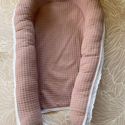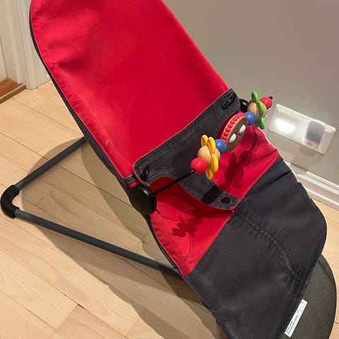 Babybjörn vippestol til barn med mykt stoff og sikkerhetssele. Stolen har en avtakbar lekeaktivitet med fargerike perler og figurer. Stoffet er i lys grå tone med noen bruksspor. Egnet for små barn som trenger støtte og komfort i sittende stilling.