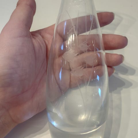glassvase i klart glass med dekorative innslag. Vasen har en høy og slank form med mønsterdetaljer som gir et unikt uttrykk.