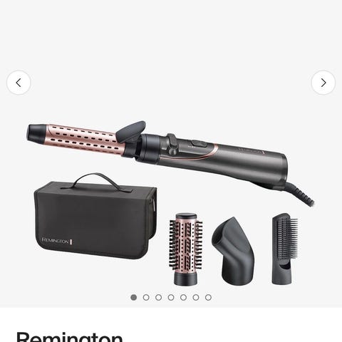 Remington Air Styler Pro 1200 hårstyler med flere børstevedlegg. Produktet er designet for å style hår ved hjelp av varm luft, og inkluderer børster for ulike stylingbehov.
