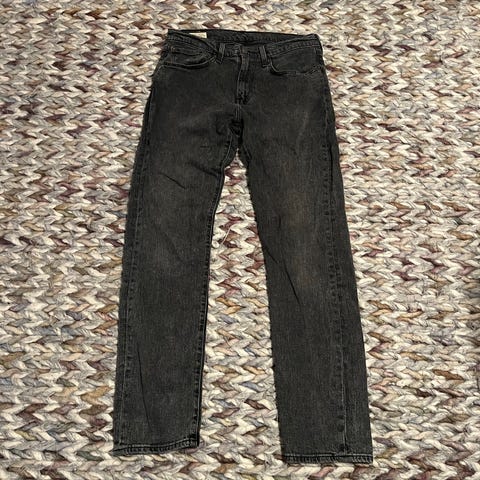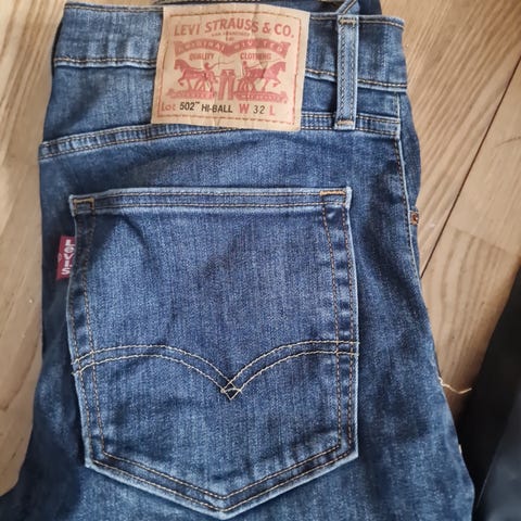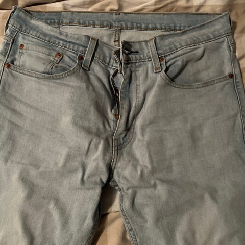 Levi's Denim bukser i størrelse med midjevidde W32 og tilsvarende lengdemål. Fargen er grå, og materialet er denim. Bukser med klassisk design og baklommer. Nederkant viser tegn på bruk med noe slitasje.
