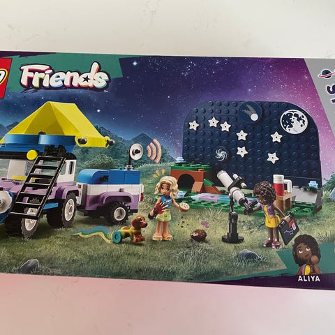 LEGO Friends 41116 romforskning bil og satellitt sett. Inkluderer en rosa og blå bil, en satellitt, en minifigur og tilbehør som en stjernekikkert og solcellepanel. Passer for barn i alderen 6-12 år.