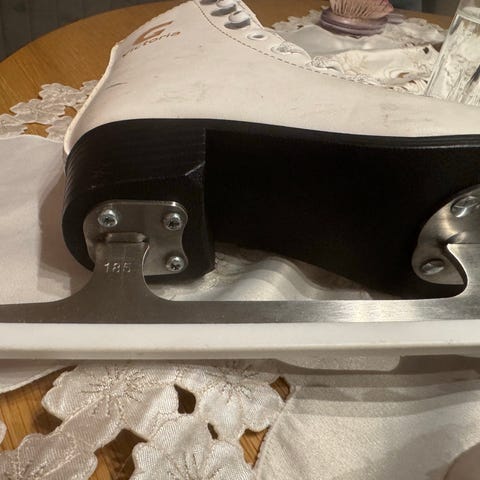 Victoria skøyter for barn, størrelse 32, i hvit farge. Skøytene har tradisjonell snøring og en lav hæl. Pent brukt. Er navnet på lapp på innsiden av skøyten