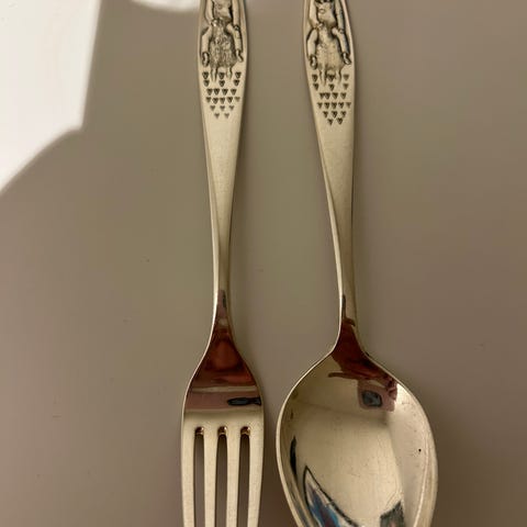 Har to skjeer - begge i original eske (i den ene esken er det også plass til en gaffel). Aldri brukt, ligger fremdeles i plast inni esken.