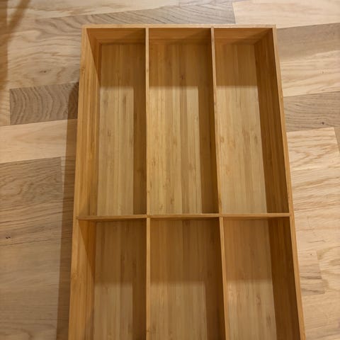 IKEA bestikkskuff laget i lyst bambusmateriale med dimensjoner på 52x50 cm. Skuffen har flere rom for organisering av bestikk og kjøkkenredskaper.