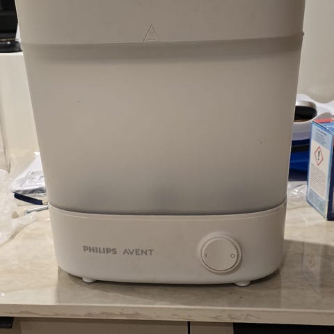 InVite Dampstrykejern med blå og hvit farge. Inkluderer strykesåle med dampfunksjon, målebeger og brukermanual. Designet for effektiv stryking av klær.