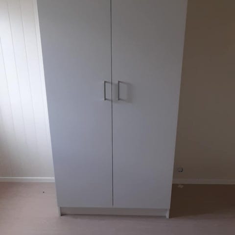 Fire skuffer en hyllerekke og en hengeseksjon.