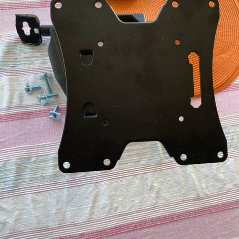 Mangler en skrue men det burde ikke spille noen rolle eller så er det bare å skru inn en egen skrue i ett av hullene.