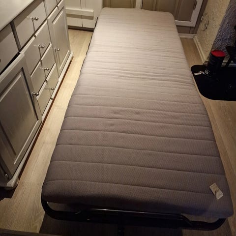 IKEA SANDVIKA sammenleggbar seng med ramme i blå metall og lameller i tre. Madrass med trekk i hvitt stoff med blå striper. Mål: 80x200 cm. Passer til midlertidig overnatting. Brukt svært bare 2 ganger!
