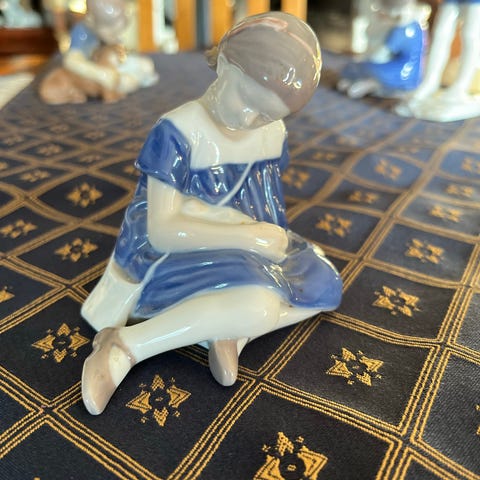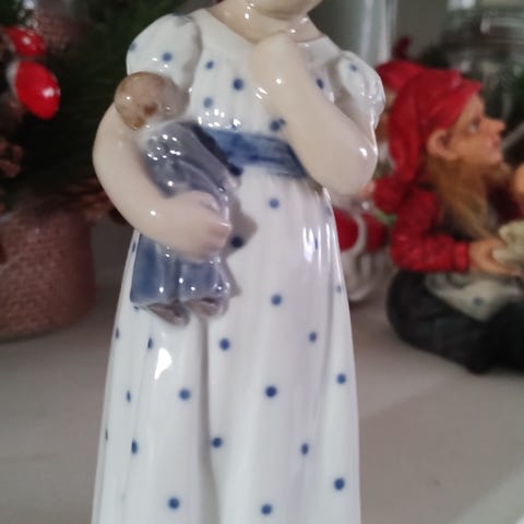 B&G figurin som forestiller en kvinne iført forkle. Laget i porselen med detaljer i blått og hvitt. Passer som dekorativ gjenstand.