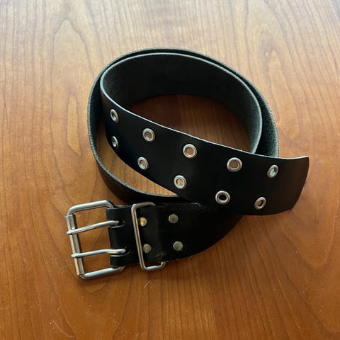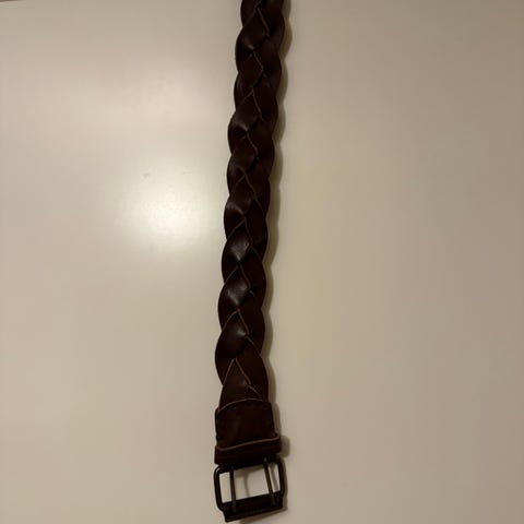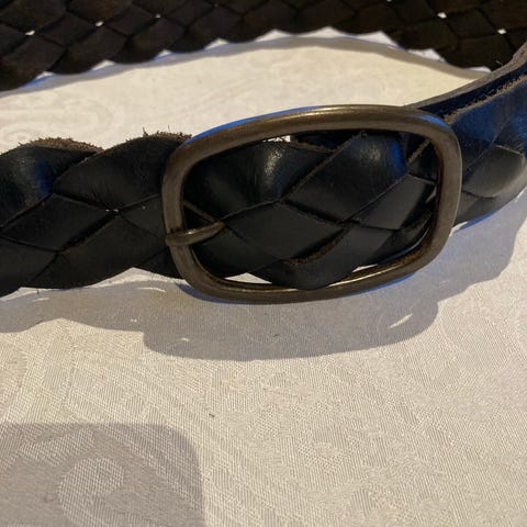 Beltet har en metallspenne i sølvfarge og flere hull for justering av størrelsen. Materialet er ekte skinn.