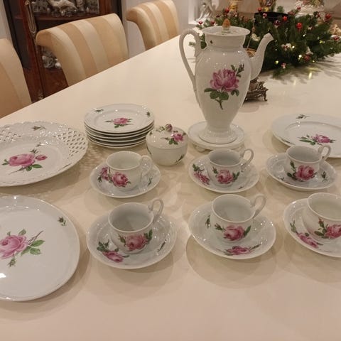 Pent retro kaffeservise i sort med gullkant. Klassisk og elegant uttrykk som passer godt både til bruk og som dekor.