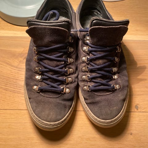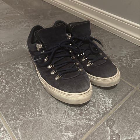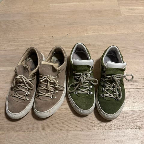 Et par ganske pent bruke diemme sko, de har ingen skader på utsiden og ser helt fine ut. De følger med boksen, extra par med lisser og støvpose. De er i fargen olivengrønn og er veldig attraktive sko. De har en liten skade inne i skoen ved hæl området, jeg merka ikke forskjell med skaden enn uten. De er str 42 men passer også til en 43/42,5