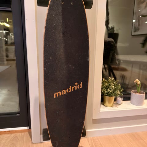 Madrid Longboard med skjelettmotiv på dekket. Brettet har store, beige hjul og metall trucks. Passer for bruk på asfalt og egnet for cruising og carving. Byttet nye hjul og griptape. Må hentes i Saltnes