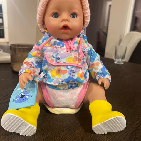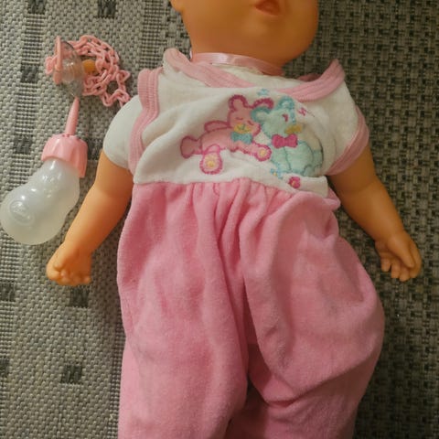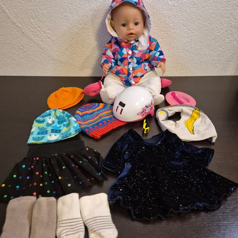 Baby Born dukke med ulike tilbehør inkludert klær, flaske, smokk, og bilsete. Dukken er kledd i rosa og hvit drakt med hette. Tilbehøret inkluderer også ekstra klær og tepper i rosa og mønstrete design. I tillegg følger det med stellebord og vugge, samt hjemmestrikkede tepper/pledd.