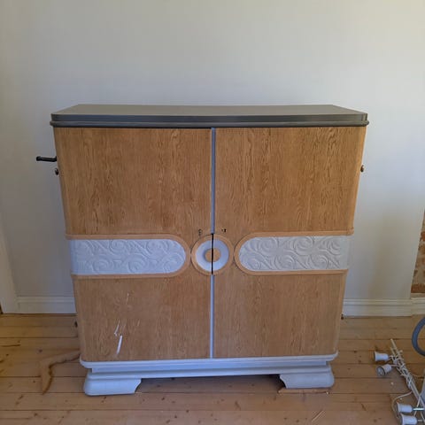 Trekommode med speil, flere skuffer og skap med hyller. Laget i tre, naturlig trefinish. Egnet for oppbevaring i hjemmet. Gis bort omgående grunnet flytting.