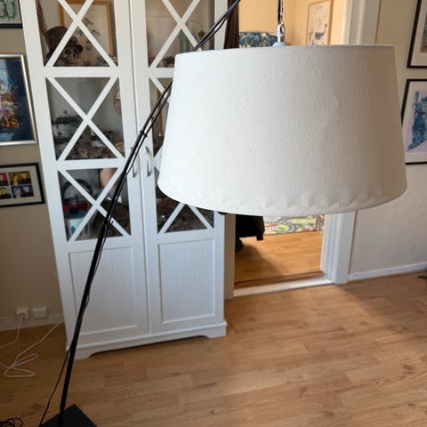 Pen og funksjonell gulvlampe i sort utførelse. Lampen har justerbar arm og lampehode, slik at lyset enkelt kan tilpasses behov – perfekt som leselampe ved sofa eller stol.