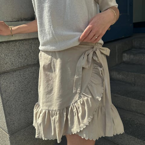 Pent brukt wrap skjørt med polkadotter fra Ghanda. Skjørtet er i str S