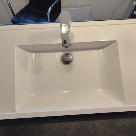 Servant med skuff og servantarmatur i hvit farge. Servanten har et rektangulært design med integrert armatur og en skuff under for oppbevaring. Passer til baderom med begrenset plass.