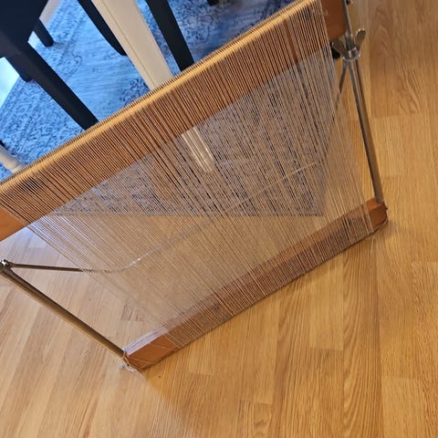 Monika vev med ferdig renning på, og mye utstyr