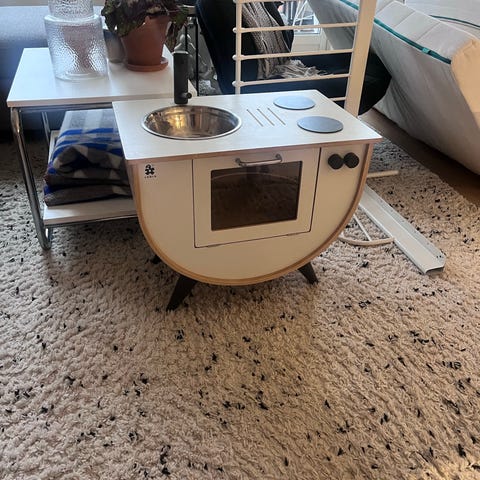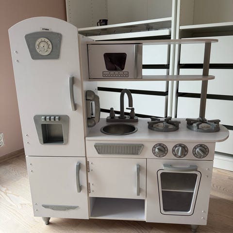 IKEA lekekjøkken med komfyr, vask og oppbevaringsskap. Kjøkkenet er laget i tre og har grå og beige farger. Inkluderer tilbehør som gryter, panner, kjøkkenredskaper og lekemat i ulike farger og materialer. Passer for barn.