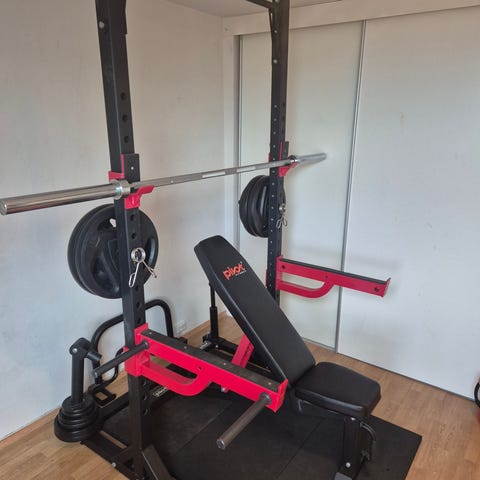 Selger Sportsmaster/Pivot sin half rack med tilhørende stang, 130 kg i bumper plates og fjærlåser. Med stang har man da totalt 150 kg. Samme pakke ligger ut på Sportsmaster sine sider til 12000 kroner.
