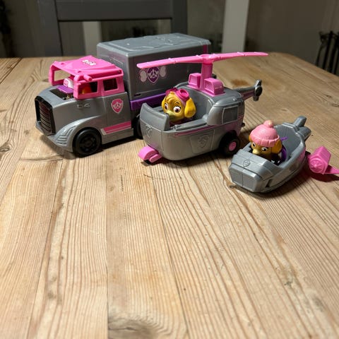 En paw patrol Sky bil med tilhørende figur. Bilen har en utløsende knapp forbi få frem vingene.