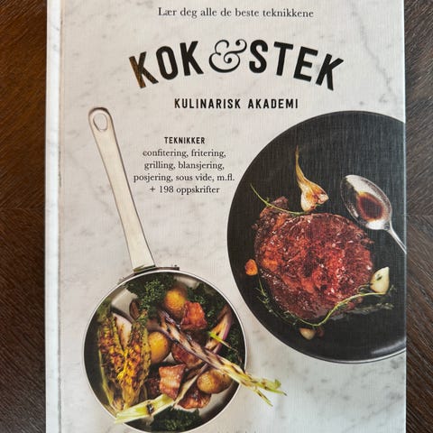 Kok & Stek Kulinarisk Akademi kokebok med oppskrifter og matlagingsmetoder. Inneholder informasjon om tilberedning av ulike retter med fokus på steking og koking. Passer for matentusiaster som ønsker å lære mer om kulinariske teknikker.