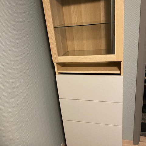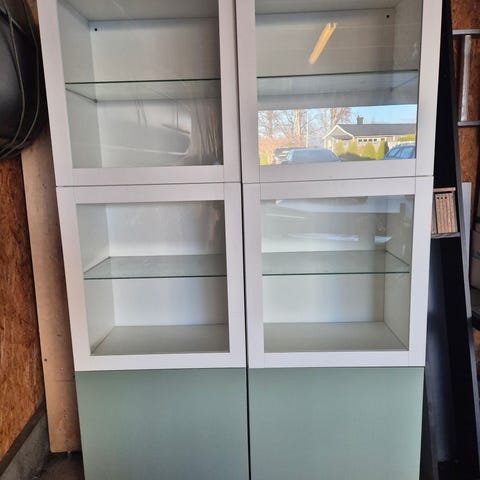 Pent brukt skap fra Ikea Bestå serien. Skapet har hvit glanset skapdører. Glasshyller i midt delen.