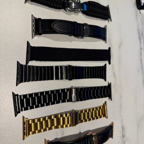 Selger en komplett pakke med klokkereimer til Apple Watch 40mm, samt lader, ladestativ og praktisk oppbevaringsmappe for reimer.