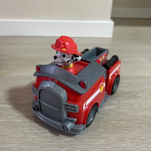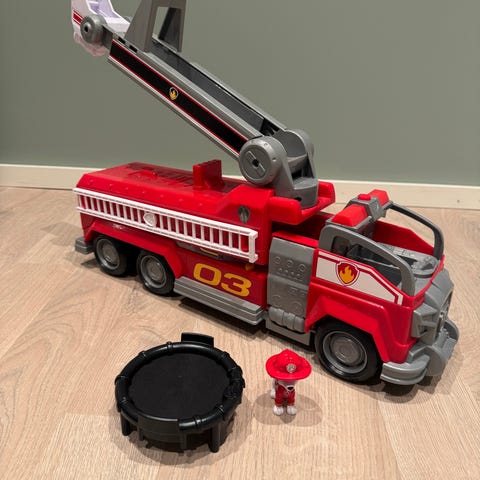 Paw Patrol Marshall brannbil leke med to figurer. Leken inkluderer en rød brannbil med åpne deler og to tilhørende figurer fra Paw Patrol-serien.