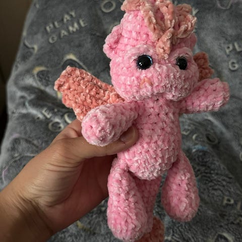 Heklet barneleke i form av en drage. Laget i blått garn med detaljer i lys blått og hvitt. Passer som leketøy for barn.