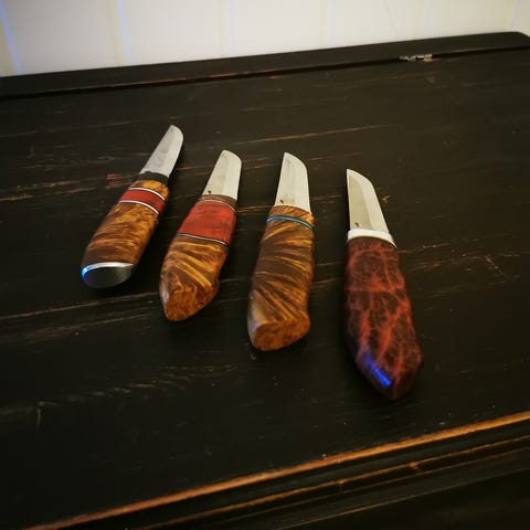 Disse knivene har vunnet NM i kjøttfag og de har delt litt vilt. Nå er denne karrieren lagt på hylla, så knivene kan flytte til noen som kommer til å bruke dem, noe de ikke har blitt brukt på lagt tid her. De er slipt opptil flere ganger, men usikker på skarpheten på eggen per i dag.