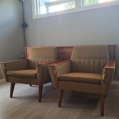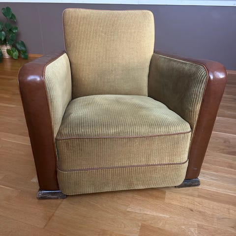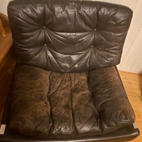 Retro lenestol/stuestol selges, muligens teak treverk. Må hentes. Trekket er helt og fint. Ypperlig oppussing prosjekt for den som har tid.