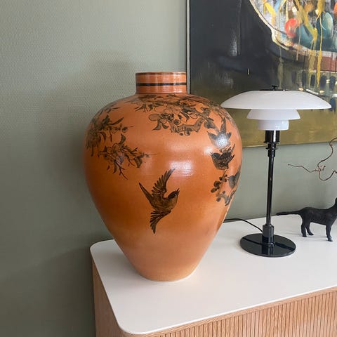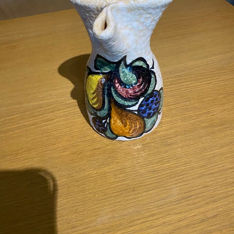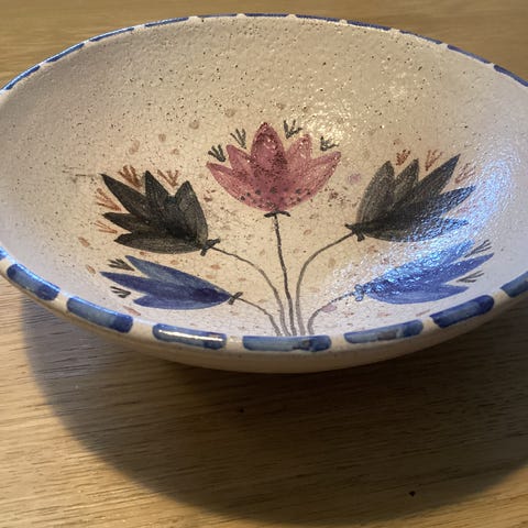 Unikt drikkebeger laget på bestilling av kvinnelig keramiker i Bø, Telemark, som jeg dessverre har glemt navnet på. Signert Håndstad. Samleverdi.