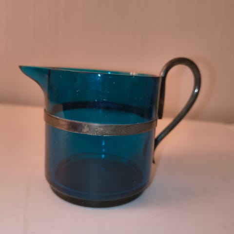 Dette er et unikt stettglass med dekor av katter, en gul og en rosa, og blomster utenpå. Glasert blått inni med lyseblå kant.